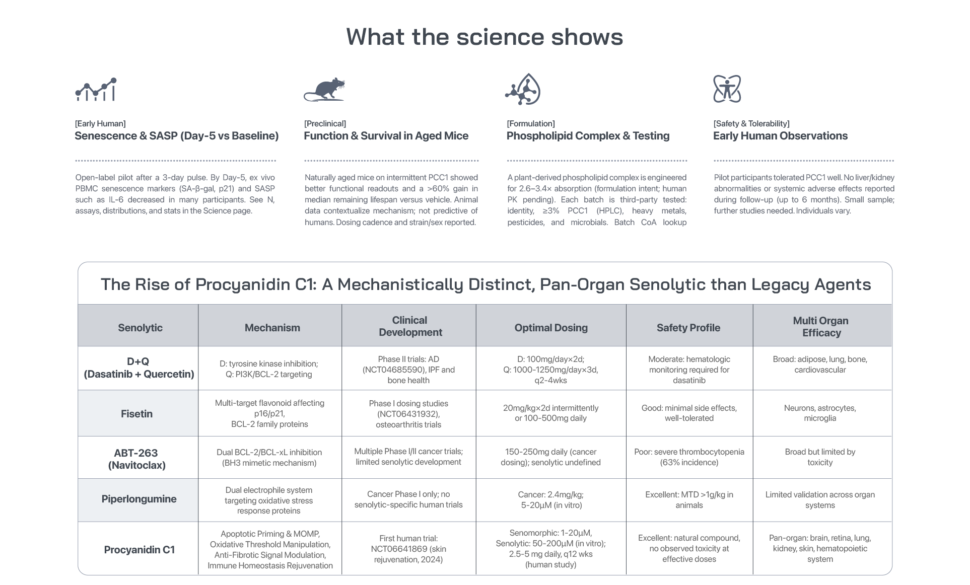 PCC1 (Procyanidin C1) is a rare polyphenolic compound derived from grape seeds. In aging research, it has been investigated for its potential roles related to senescent cells and SASP modulation. The formulation applies a plant-based phospholipid delivery system that has been explored for improved bioavailability.