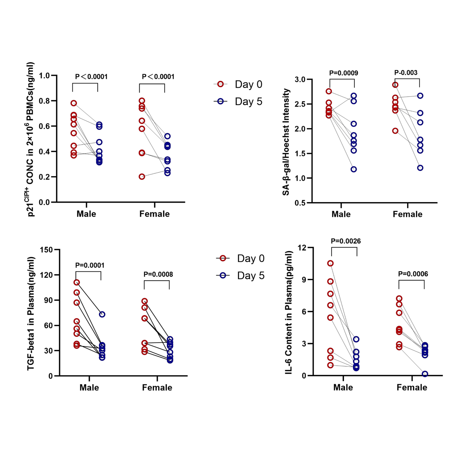 We share results from an early human study, where selected biomarkers were measured before and after short-term supplementation. Changes were observed in markers such as p21 and IL-6. These results are considered preliminary and are currently under peer review. The purpose of sharing is transparency, not to suggest medical conclusions. More research, including larger and controlled studies, will be needed to confirm these findings.