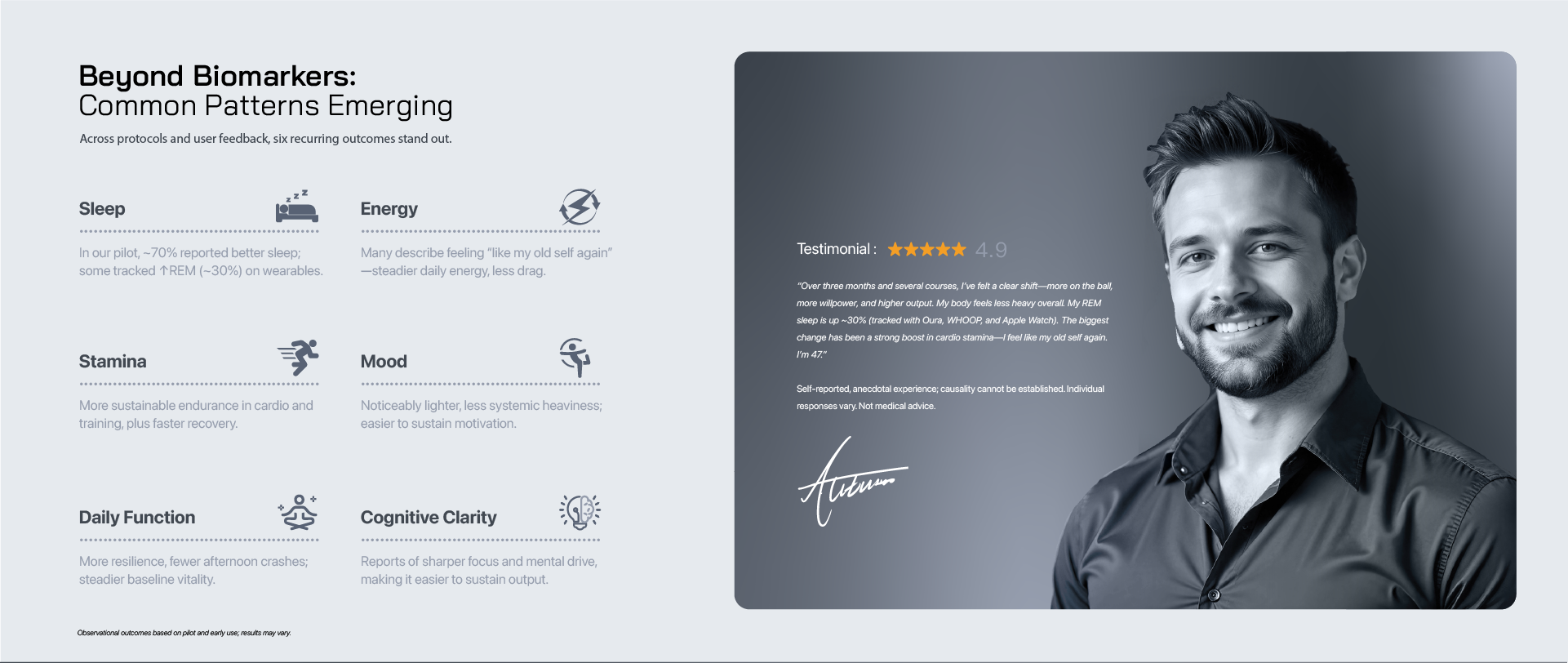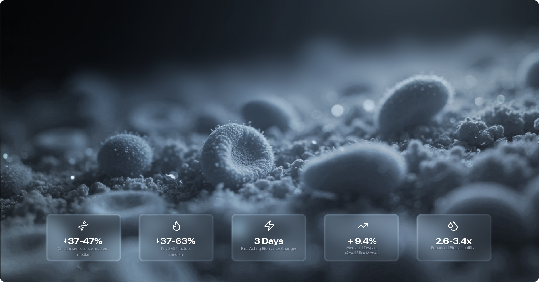 We share results from an early human study, where selected biomarkers were measured before and after short-term supplementation. Changes were observed in markers such as p21 and IL-6. These results are considered preliminary and are currently under peer review. The purpose of sharing is transparency, not to suggest medical conclusions. More research, including larger and controlled studies, will be needed to confirm these findings.